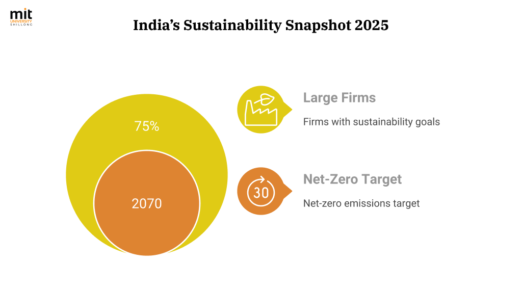 Today, sustainability is no longer a niche topic. Many companies place it at the core of their strategy. In India, around 75 % of large firms have set clear sustainability goals. Companies now see green business practices as a source of competitive advantage and risk mitigation. Government targets such as net‑zero emissions by 2070 also push the agenda for sustainable enterprise in the country.